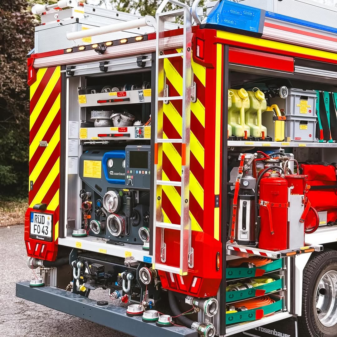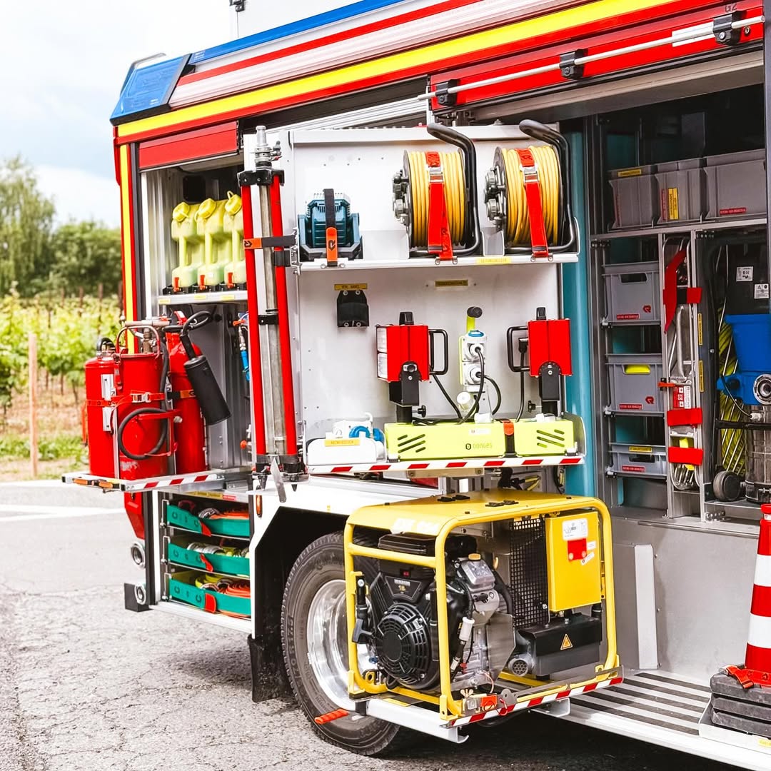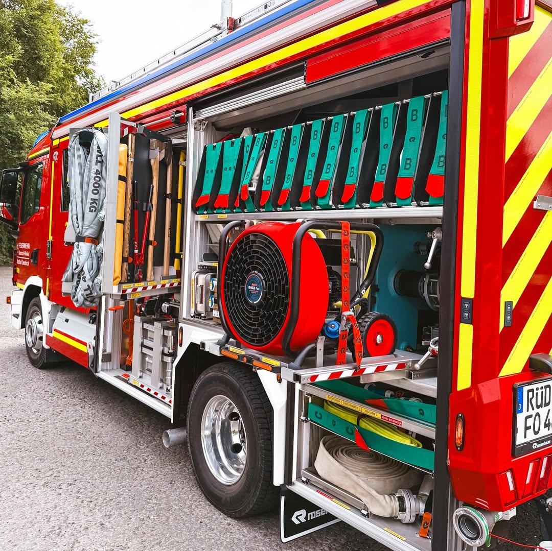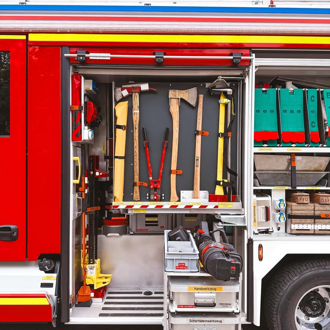 Zur Menschenrettung ist eine vierteilige Steckleiter und eine Schleifkorbtrage sowie ein Rettungsbrett verladen.